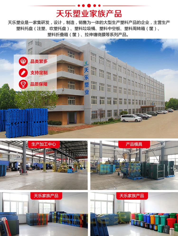 天樂塑業(yè)是一家集研發(fā),設(shè)計(jì),生產(chǎn),銷售為一體的大型塑料制品的企業(yè),公司擁有大型注塑吹塑設(shè)備、托盤焊接設(shè)備十多臺(tái),截止目前產(chǎn)品模具多達(dá)七八十種,產(chǎn)品規(guī)格品類繁多,公司擁有經(jīng)驗(yàn)豐富的設(shè)計(jì)研發(fā)人才、設(shè)備維保技師,可提供產(chǎn)品顏色、重量、logo等定制服務(wù)、代加工服務(wù)。公司主營(yíng)生產(chǎn):塑料托盤、塑料垃圾桶、塑料周轉(zhuǎn)箱(筐)、塑料折疊箱、PP中空板、拉伸纏繞膜等系列產(chǎn)品。